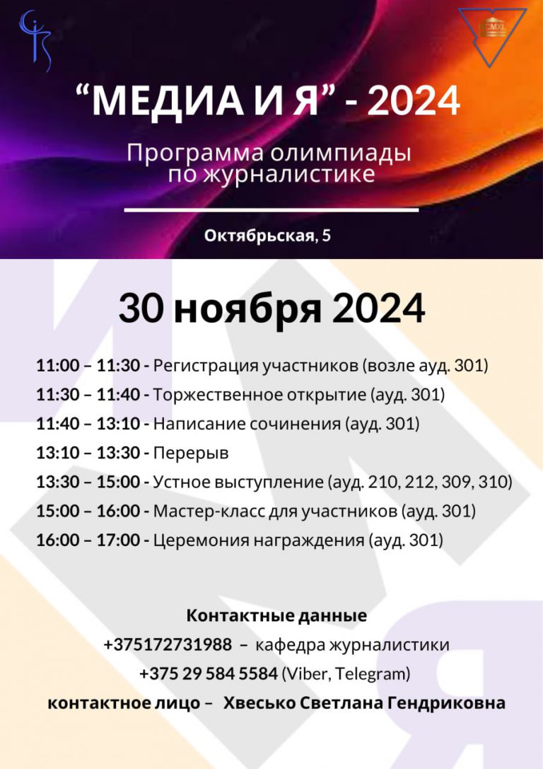 Приглашаем принять участие в олимпиаде по журналистике «Медиа и я» -2024, которая состоится с 28 октября по 3 ноября 2024г. (заочный тур) и 30 ноября 2024 г. (очный тур) в Гродненском государственном университете имени Янки Купалы.